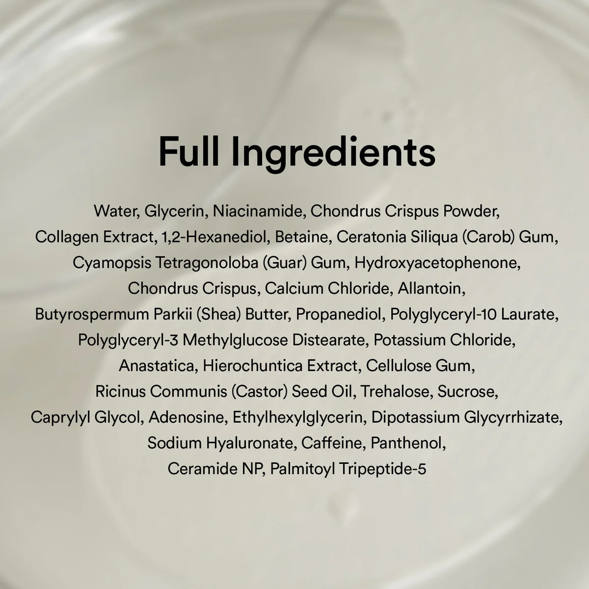 Water, Glycerin, Niacinamide, Chondrus Crispus Powder, Collagen Extract, 1,2-Hexanediol, Betaine, Ceratonia Siliqua (Carob) Gum, Cyamopsis Tetragonoloba (Guar) Gum, Hydroxyacetophenone, Chondrus Crispus, Calcium Chloride, Allantoin, Butyrospermum Parkii (Shea) Butter, Propanediol, Polyglyceryl-10 Laurate, Polyglyceryl-3 Methylglucose Distearate, Potassium Chloride, Anastatica, Hierochuntica Extract, Cellulose Gum, Ricinus Communis (Castor) Seed Oil, Trehalose, Sucrose, Caprylyl Glycol, Adenosine, Ethylhexylglycerin, Dipotassium Glycyrrhizate , Sodium Hyaluronate, Caffeine, Panthenol, Ceramide NP, Palmitoyl Tripeptide-5